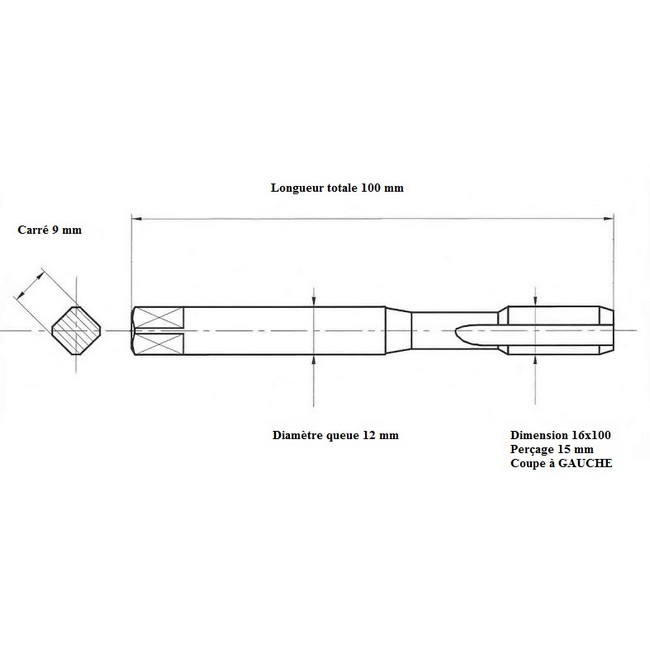 Taraud pas métrique fin 16x100 GAUCHE
