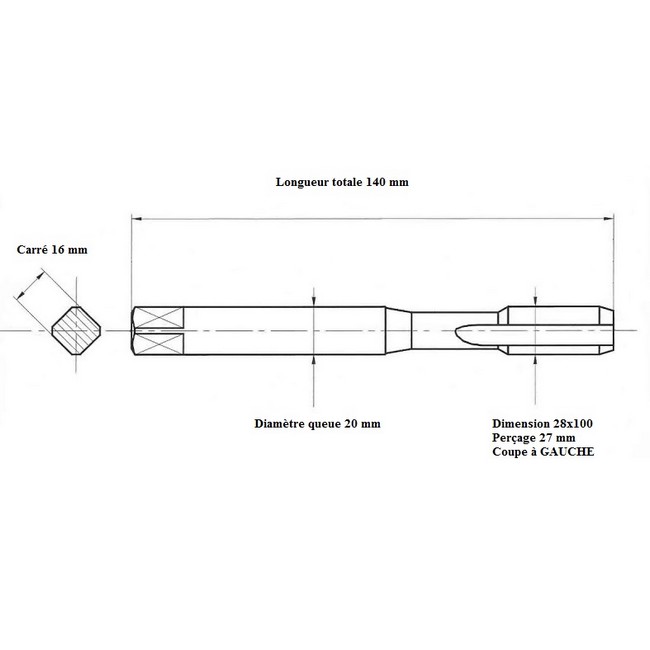 Taraud pas métrique fin 28x100 GAUCHE
