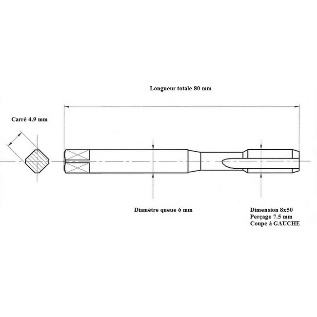 Taraud pas métrique fin 8x50 GAUCHE
